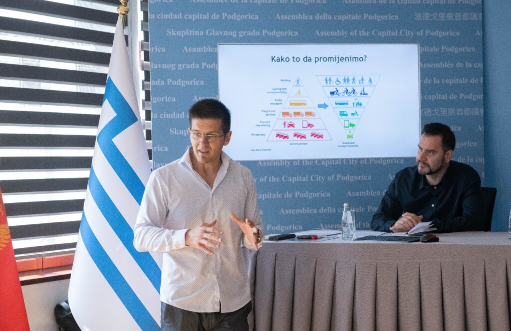 Poseban doprinos radionici dao je dr Aljaž Plevnik sa Urbanističkog instituta Republike Slovenije, koji je predstavio iskustva Ljubljane u rješavanju saobraćajnih izazova na održiv način i zajedno sa odbornicima analizirao mogućnosti njihove primjene u Podgorici.